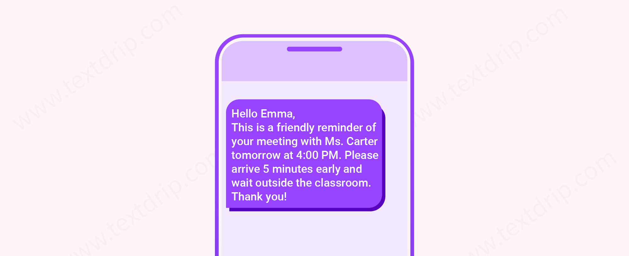 If you want your students, staff, and parents on top of things, reminder text messages are a great way. Schools can send enrollment reminders, parent-teacher meeting reminders, test reminders, report card reminders, fee reminders, purchasing book reminders, etc.