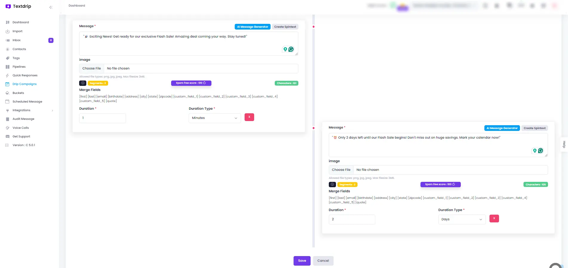 6) In this step, you need to craft personalized messages for the SMS drip campaign, as shown in the image below, and set up its duration. After that, click on Save.