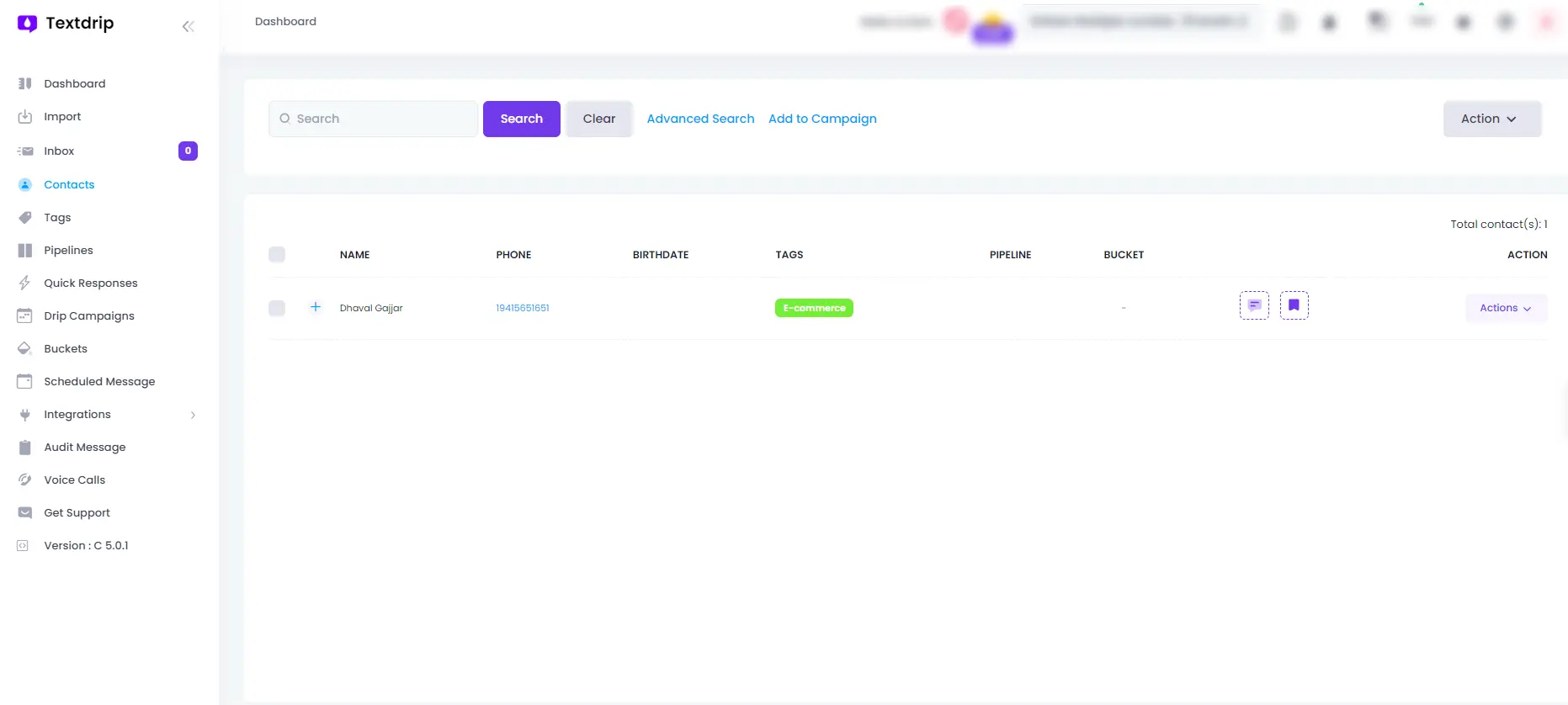 7) In the left side panel, select contacts. Here, you can see contacts’s names, phone numbers, etc. You can assign tags, too. You can see in the image below the E-commerce Tag.