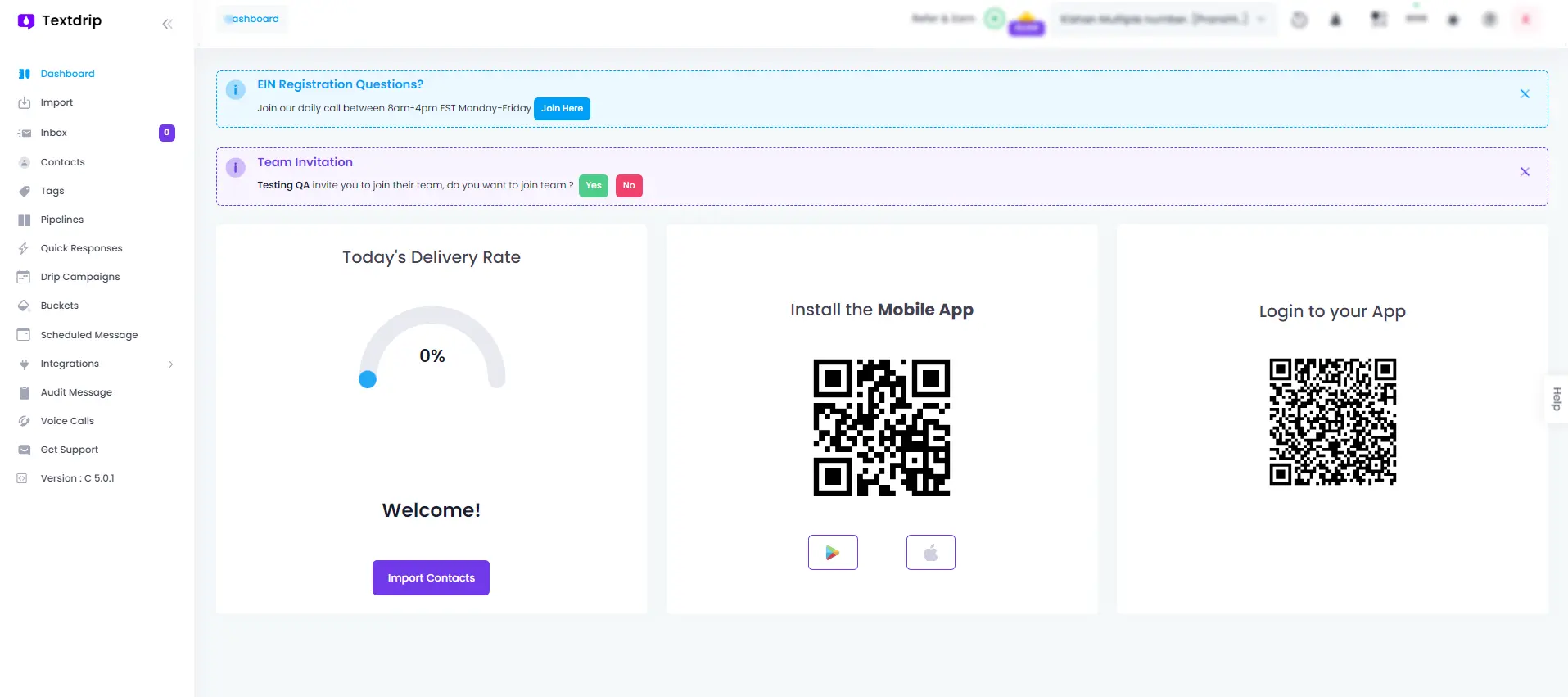 2) Once you log into the Textdrip app, you will see this dashboard. You need to import your contact list here.