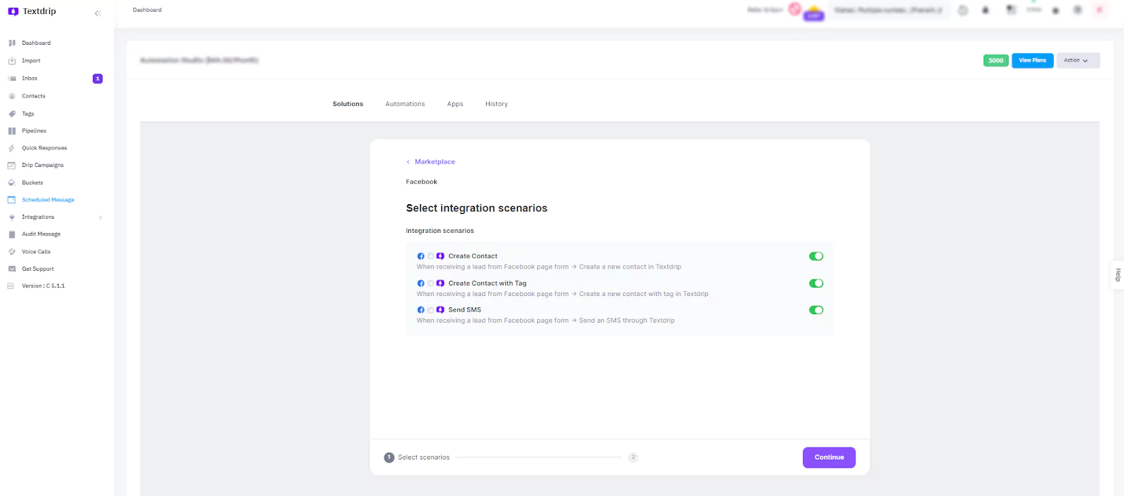 In the screen that appears, you’ll see different integration scenarios designed for specific use cases. From there, you have to choose the scenario that best fits your SMS campaign goals. Once you’ve selected the scenario, click “Continue” to move forward.