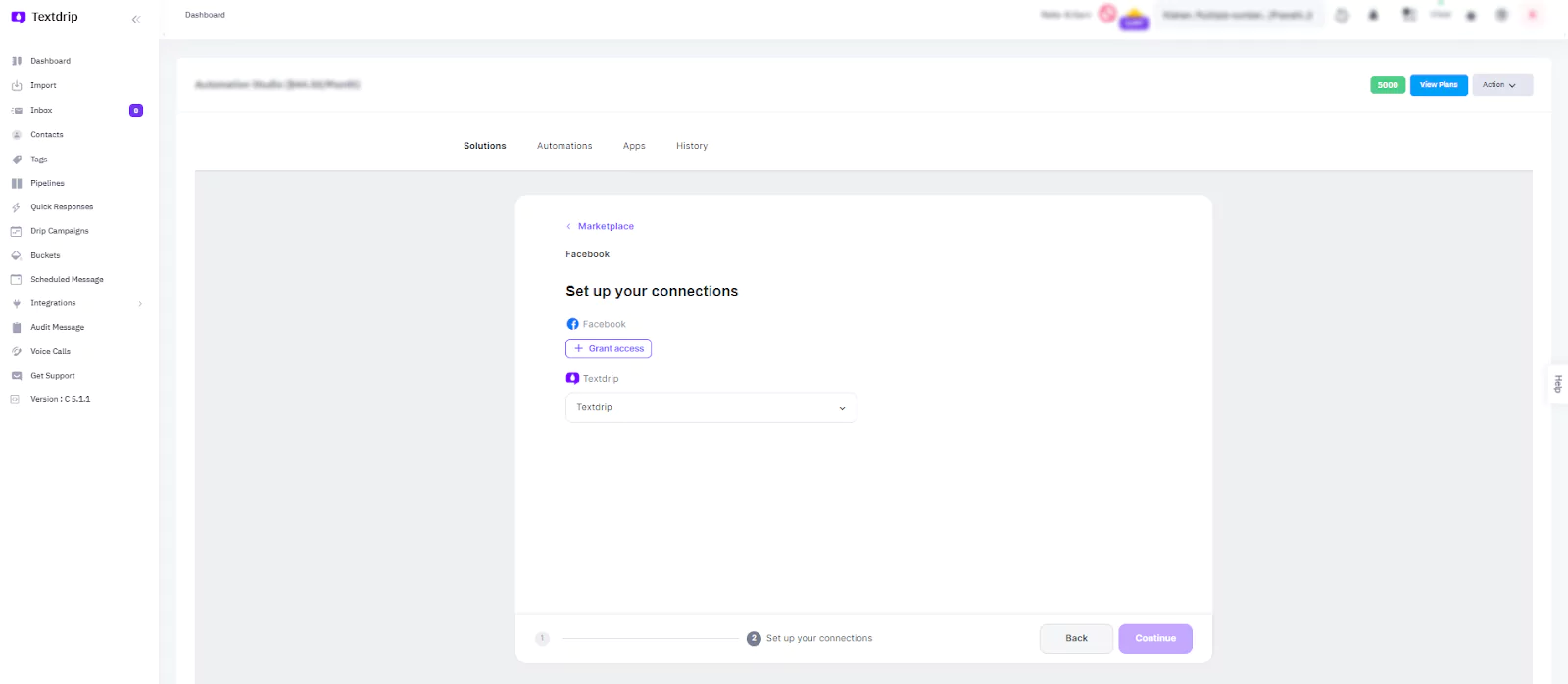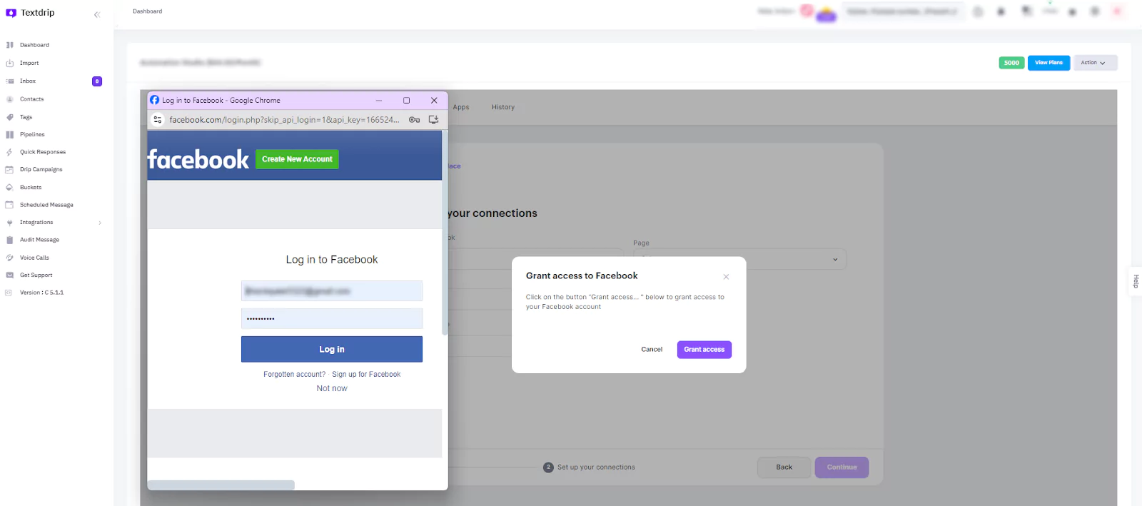 You’ll be redirected to a screen where Textdrip will request permission to access your Facebook account. To authorize Textdrip to capture leads from Facebook, click on the “Grant Access” button which allows Textdrip to connect with your Facebook Business account, pages, and ads.