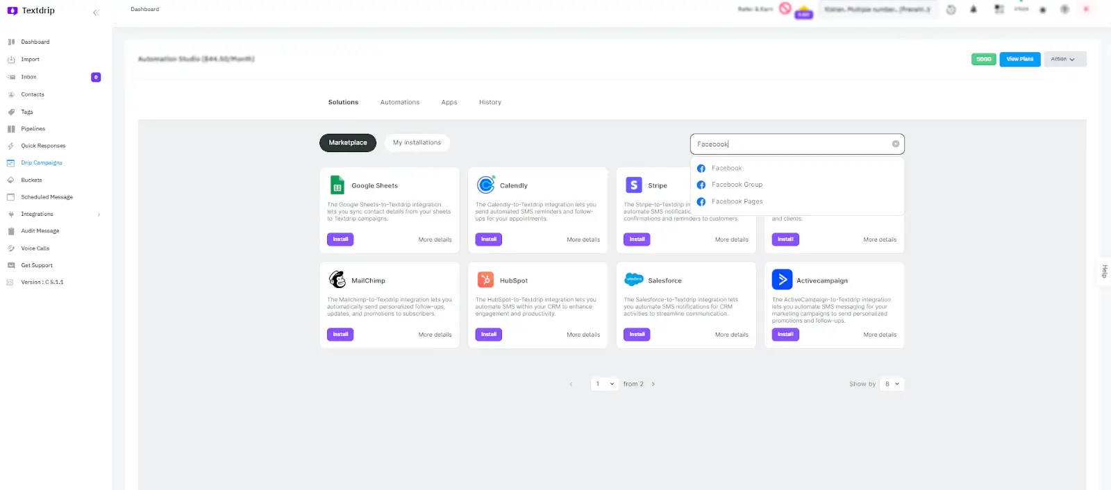 On the Automation Studio page, you’ll see a list of available applications for integration. At the top, there’s a search bar. Type “Facebook” into the search field. The Facebook app option should appear in the results.