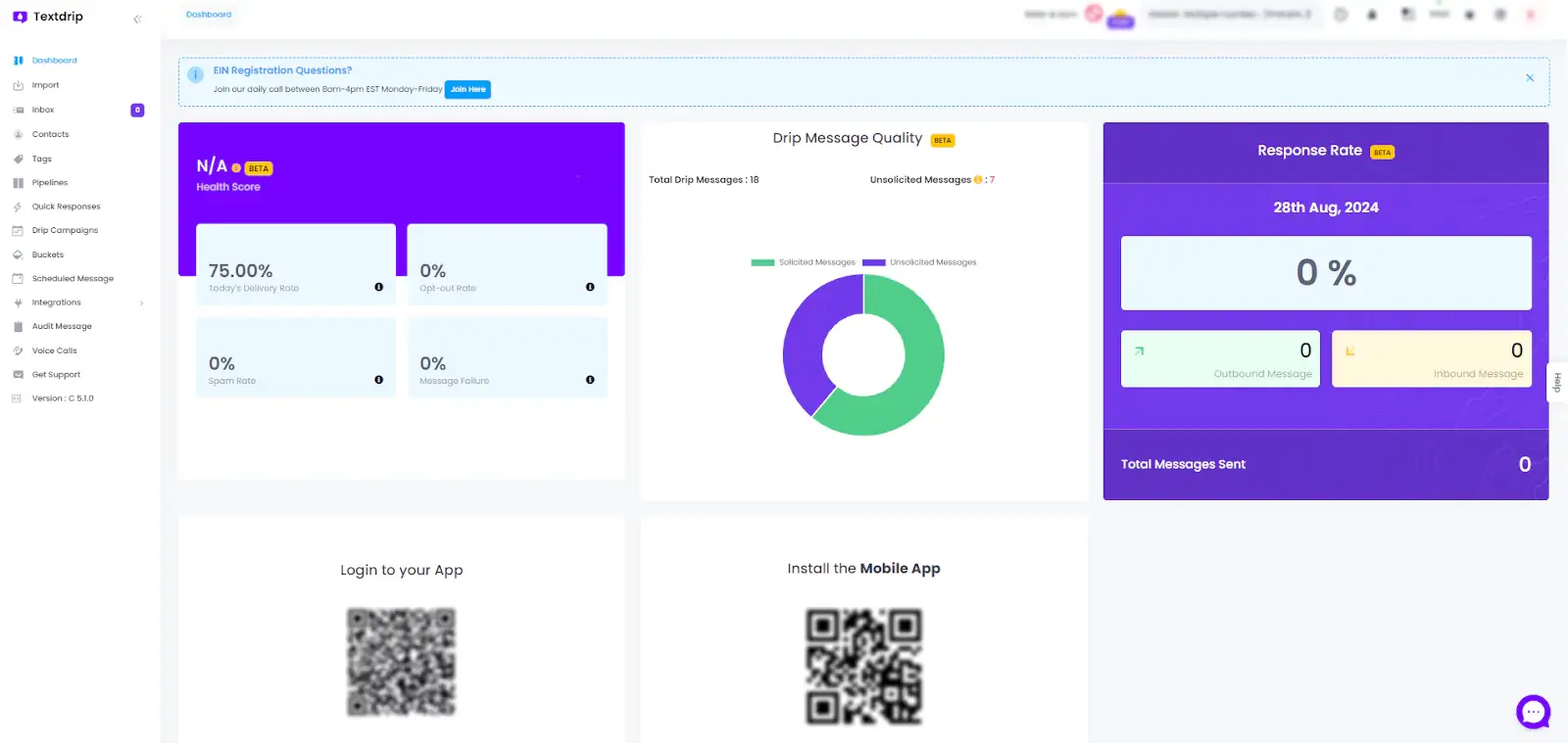 To start the integration process, Open your browser and go to app.textdrip.com. Log in with your Textdrip credentials. Once you’re on the Textdrip Dashboard, look to the left-hand navigation menu and click on “Integration”.